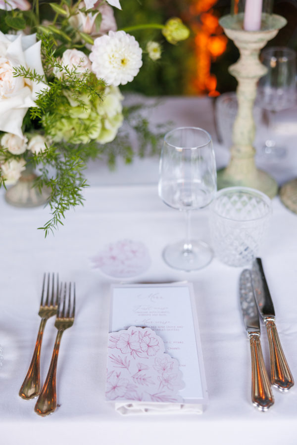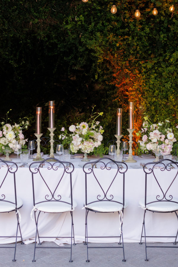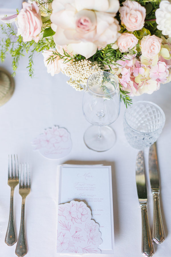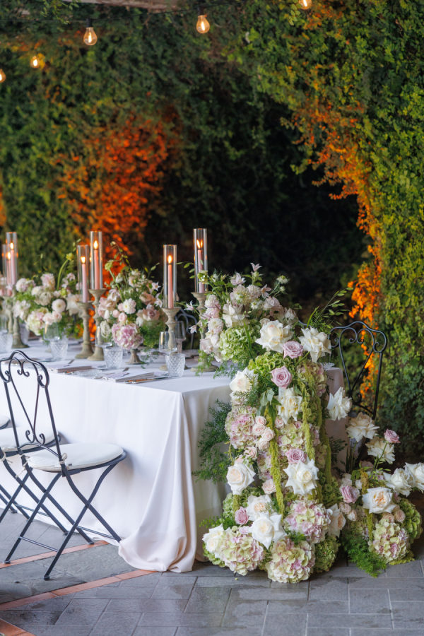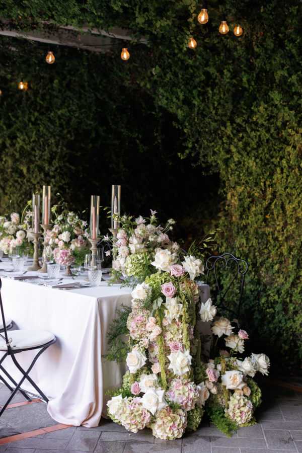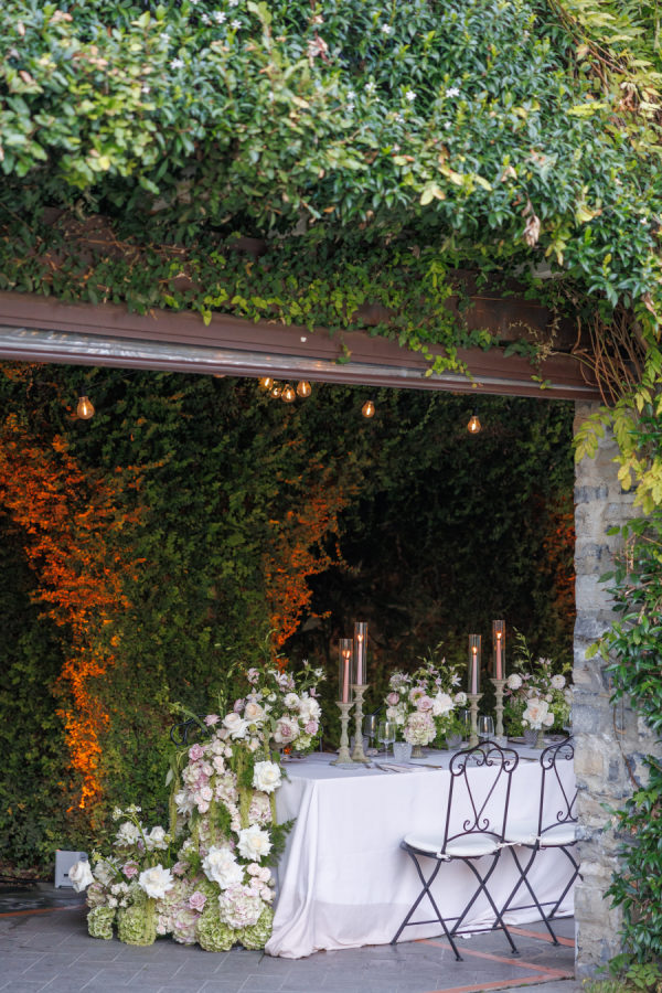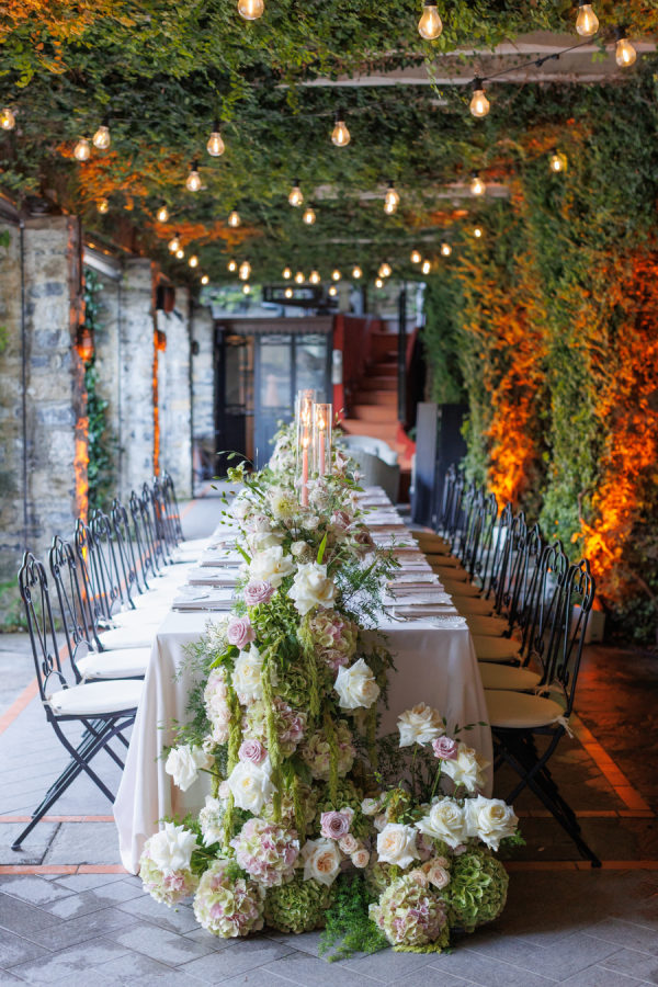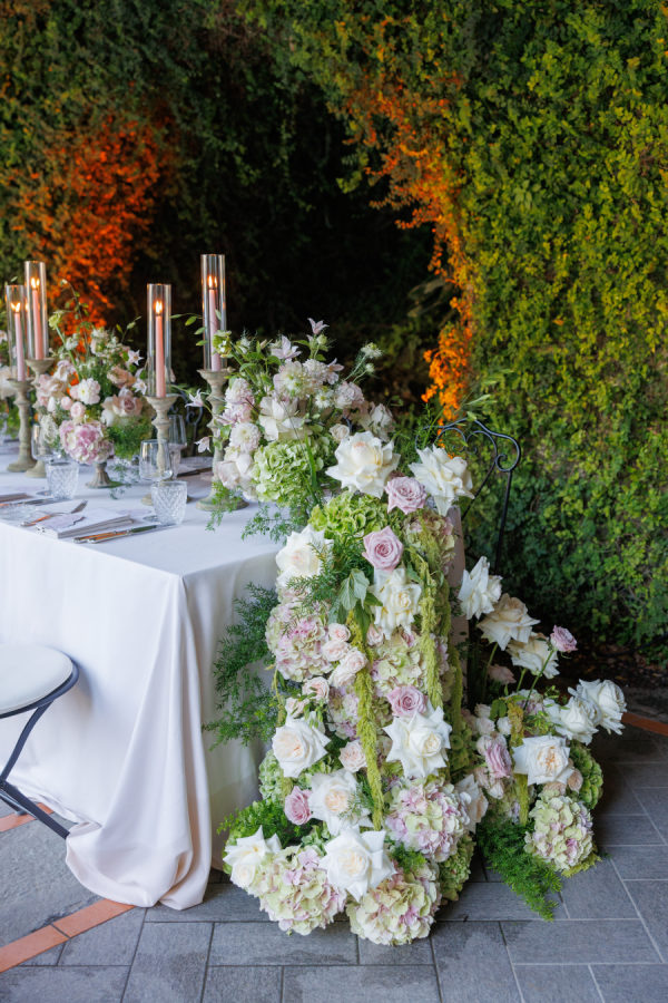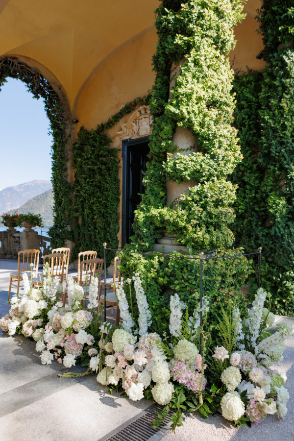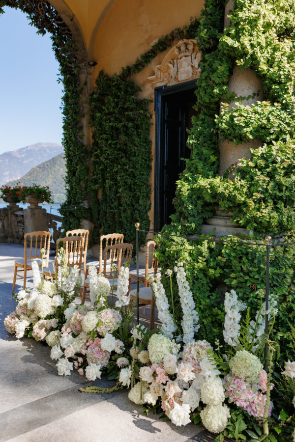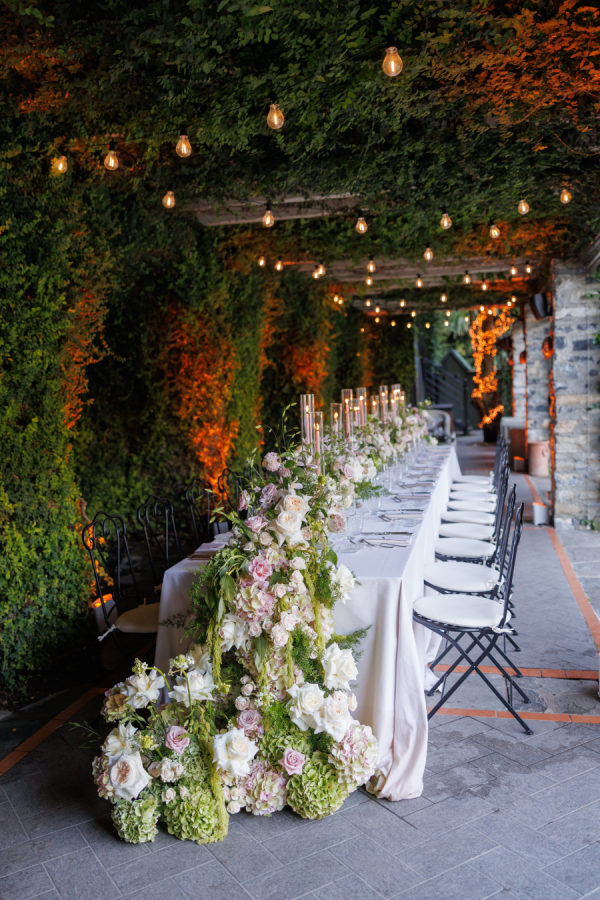 Florals were provided by Figli dei fiori for the ceremony and Petali di Alice for the reception. We wanted a cohesive classic look for the flowers, using only light pinks, greens, and white. For the ceremony, beautiful flowers lined the aisle. A cascading flower scape was used for the reception table. We wanted the flowers to accentuate the beautiful scenery Lake Como provided.