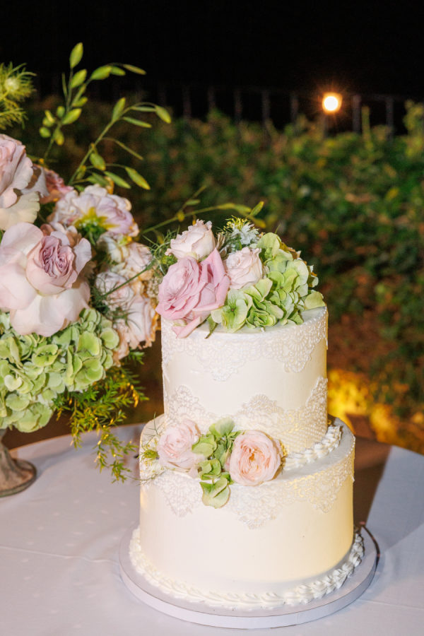 The wedding cake was a two-tier vanilla cake with Chantilly cream and berries. The cake was decorated with a floral pattern with fresh flowers on top to match the ceremony flowers.