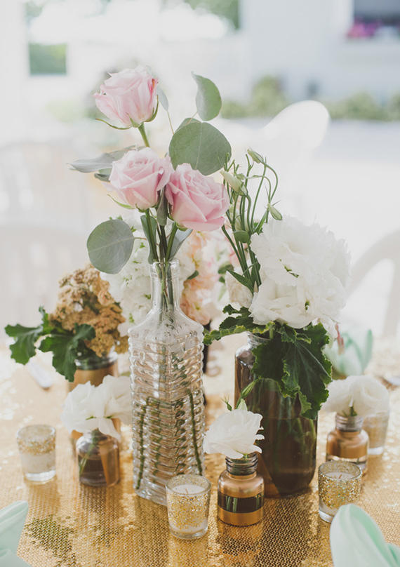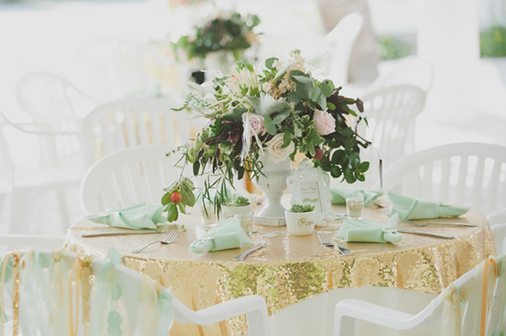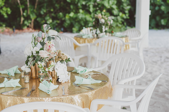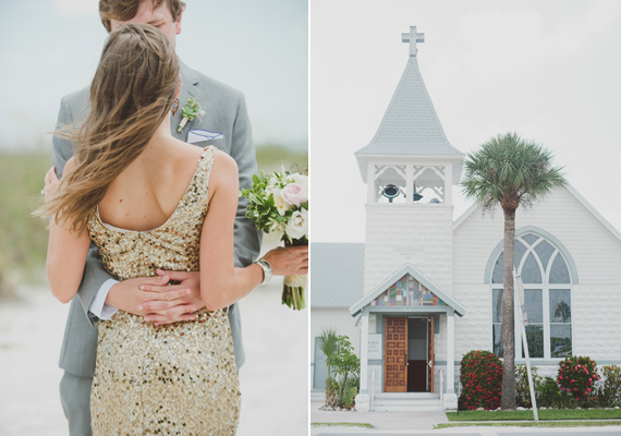 These two hit all the right marks. They wanted a vacation and a wedding, so they decided on a destination wedding. They’re parents after all, and rightfully so deserve a vaca. They wanted a laid back beach wedding with a touch of traditional elements, so they invited a few close friends and family to celebrate at their annual summer getaway spot, Anna Maria Island, in Florida. Lastly, in early 2013, Dixie Pixel Photography held a contest for free wedding photography, and Anne & Drew won! In addition, they also won $1500 towards floral and decor from Whimsical Gatherings. Oh, and don’t think her gold sequin wedding dress (and table linens!) are going unnoticed…
