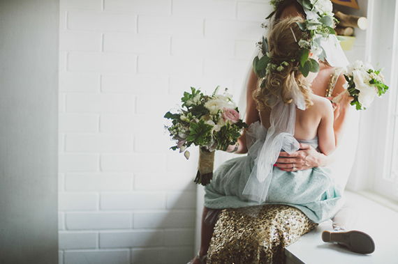 How beautiful is this moment of Anne Marie and her sweet daughter, Gwen? Anna Marie and her mother worked on the pattern for Gwen’s dress together using a mix of vintage sparkly tule and floral fabric. P.S You can see more photos of little Gwen’s dress in our full gallery!