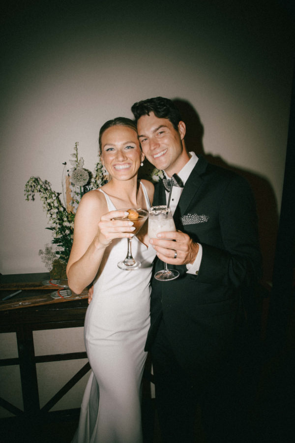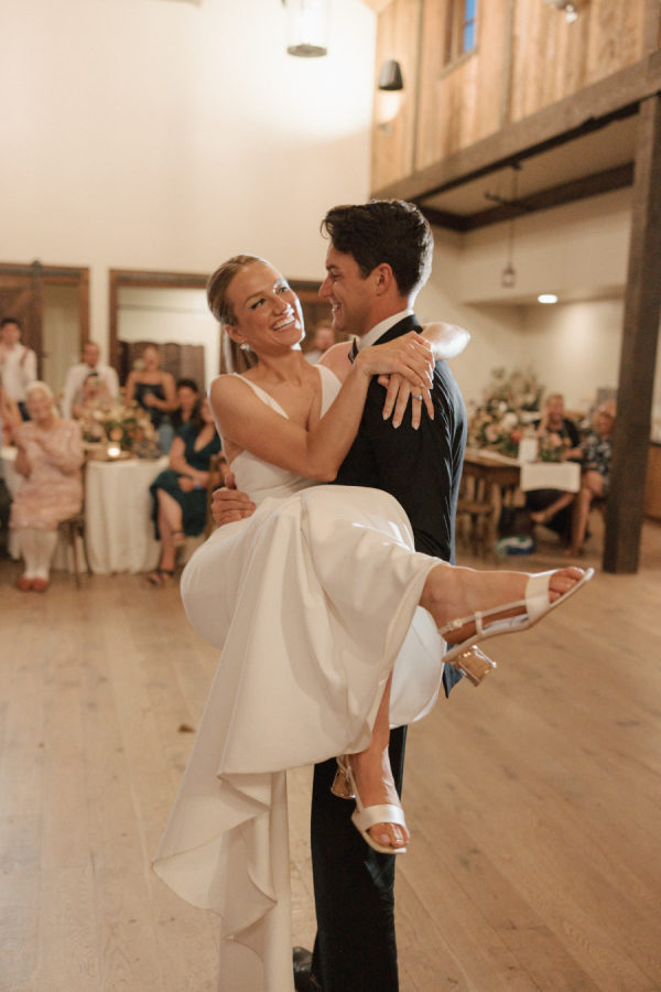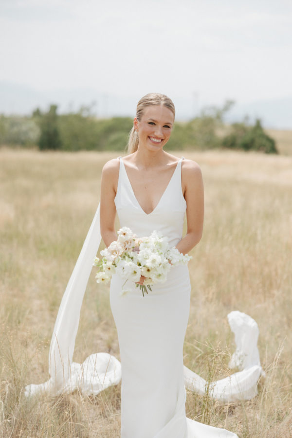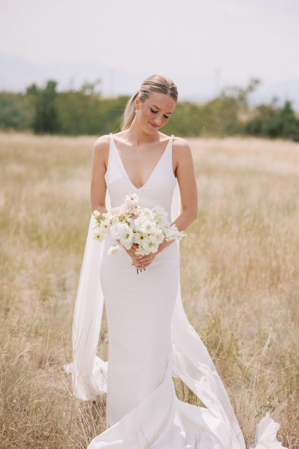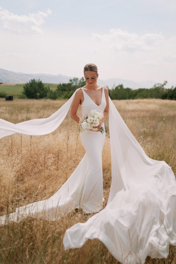 The bride wore a sleek, form-fitting gown with a low back and flowing cape wings that caught the light breeze of Paradise Valley beautifully. The minimalist design highlighted her silhouette while the cape added a striking touch, creating a modern and elegant look that complemented the stunning natural landscape. The bride’s shoes were Kate Spade Soiree Slingback Pumps that used a champagne cork for the heel.