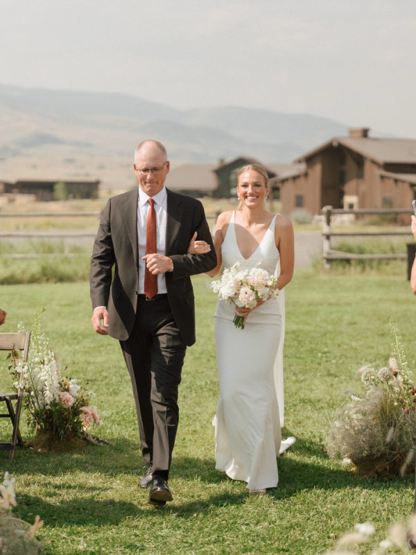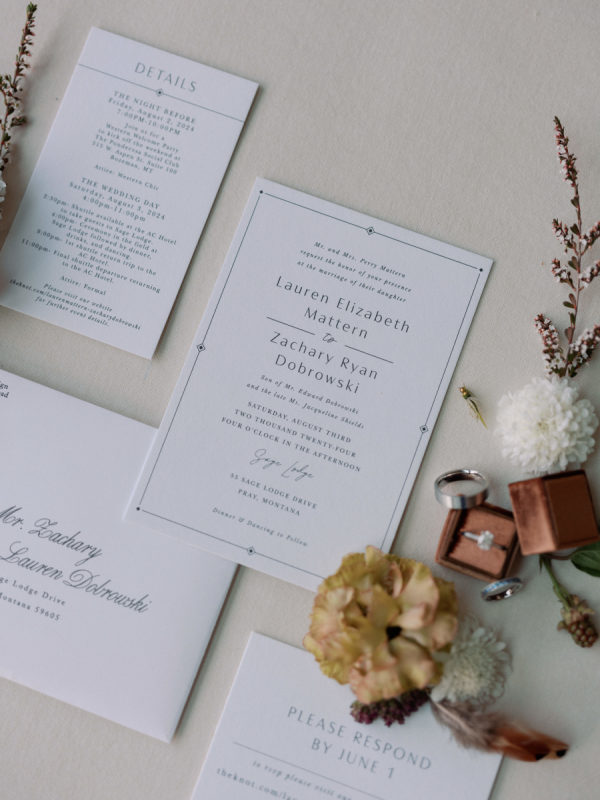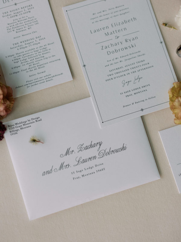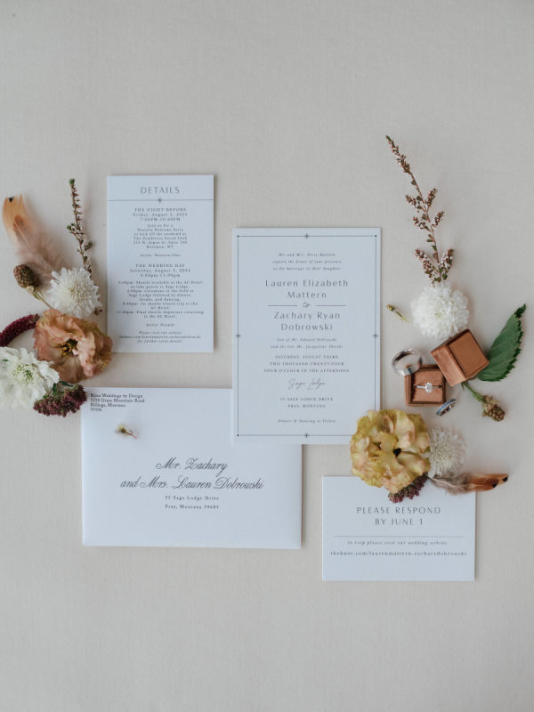 In our vision for this special celebration, we set out to weave the enchanting essence of Montana’s natural beauty into every detail. Our goal was to elevate the organic aesthetic while ensuring that guests felt immersed in a luxurious experience, all while perfectly complementing the venue’s stunning features. We drew inspiration from the couple’s love for their favorite local escapes along the river, guiding us in selecting everything from the florals (adorned with driftwood and organic matter) to the paper goods that echoed the beauty of the great outdoors. Each table was thoughtfully designed to reflect this connection, featuring escort cards adorned with charming fishing flies and place cards elegantly tied to napkins with leather twine, complete with a delicate feather tucked inside to tie the theme together. This signature element extended to the invitations as well, each one hand-wrapped in leather and embellished with a feather, echoing the couple’s love for the river and fly fishing. For the ceremony area, we curated an enchanting display of mainly white, organically shaped lush florals to contrast beautifully with the vibrant green field, creating a timeless, summery atmosphere. The bridesmaids’ stunning copper-colored gowns highlighted the subtle warm tones present in the flowers, making for a striking visual against the golden fields that surrounded them under Emigrant Peak. As we moved into the reception space, we aimed to infuse a touch more warmth with our color palette, which complemented the natural wood accents of the venue beautifully. We chose linens with a textured, earthy feel, which served as the perfect backdrop for the breathtaking floral arrangements that resembled little natural art installations on each table. These displays, adorned with drifts of wood, delicate mushrooms, lichen, and other natural treasures found along the river, brought an enchanting touch of the great outdoors directly into the celebration, inviting guests to immerse themselves in the beautiful outdoors. This design celebrates both nature and the couple’s unique story, making each moment a beautiful reflection of their journey together. Julia Moyers Planning & Design Bijou Weddings by Design