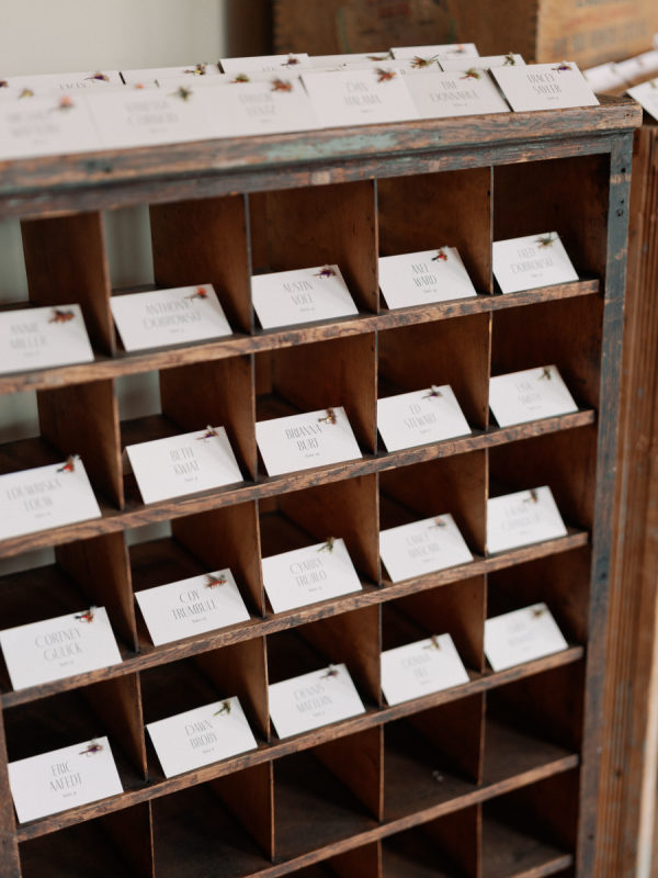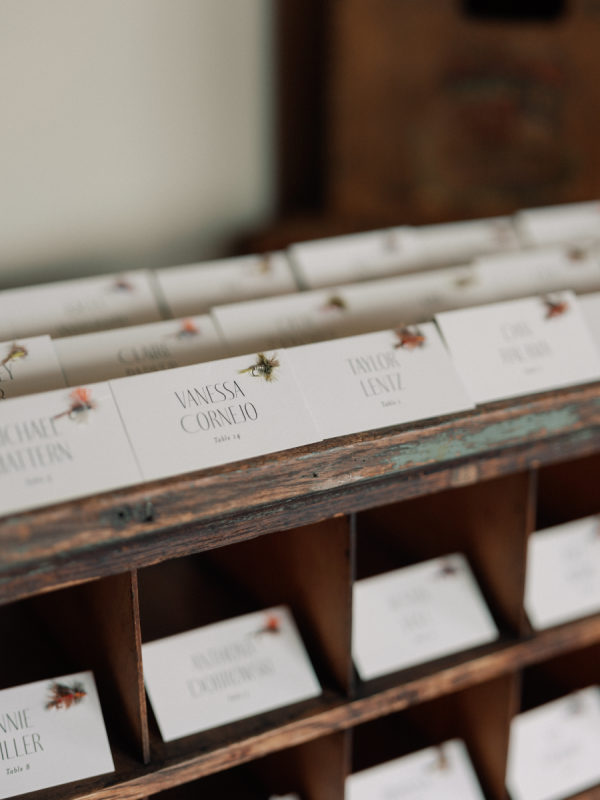 The feathers and fishing flies seamlessly intertwined throughout the wedding, reflecting the couple’s love for the outdoors and their connection to Montana’s natural beauty. The elegant feather bow tie worn by the groom was mirrored in the delicate touches found in the decor, enhancing the overall theme. Escort cards adorned with charming fishing flies creatively tied back to the couple’s shared passion for fly fishing, making each detail a personal testament to their journey together. These elements not only celebrated their story but also created a unique and cohesive aesthetic throughout the day.