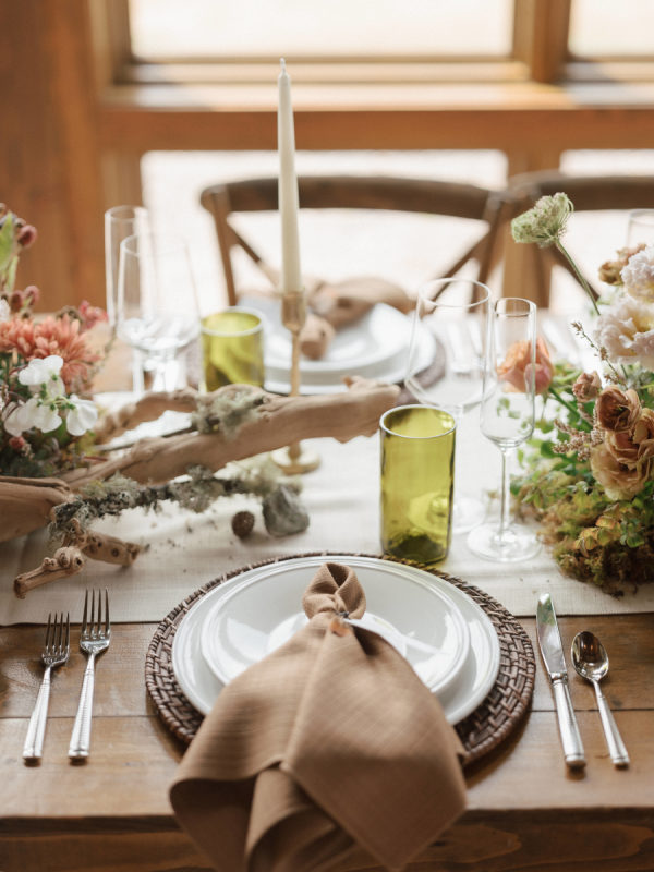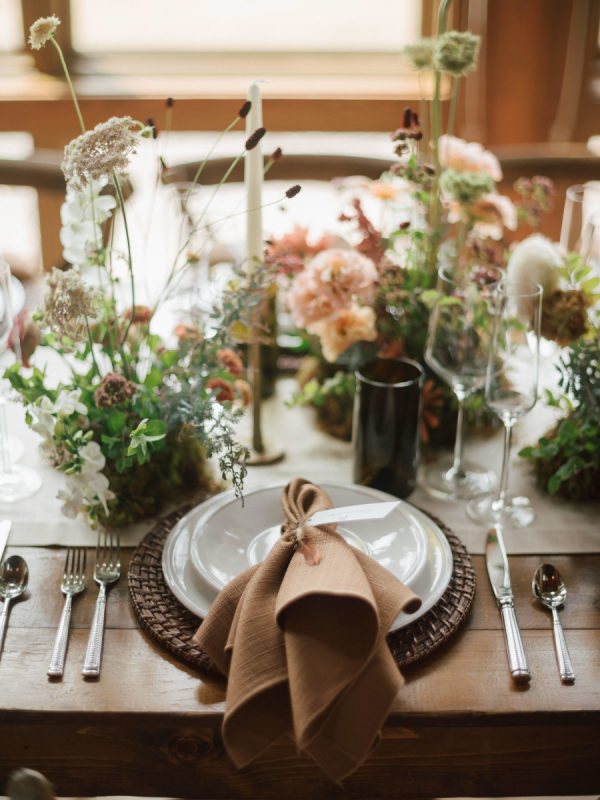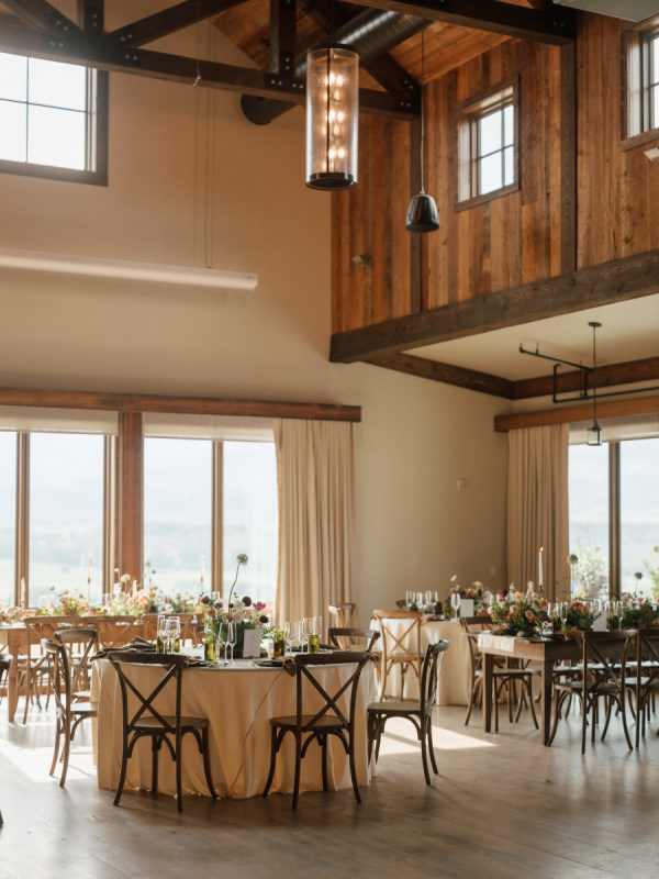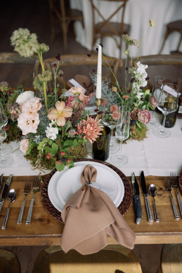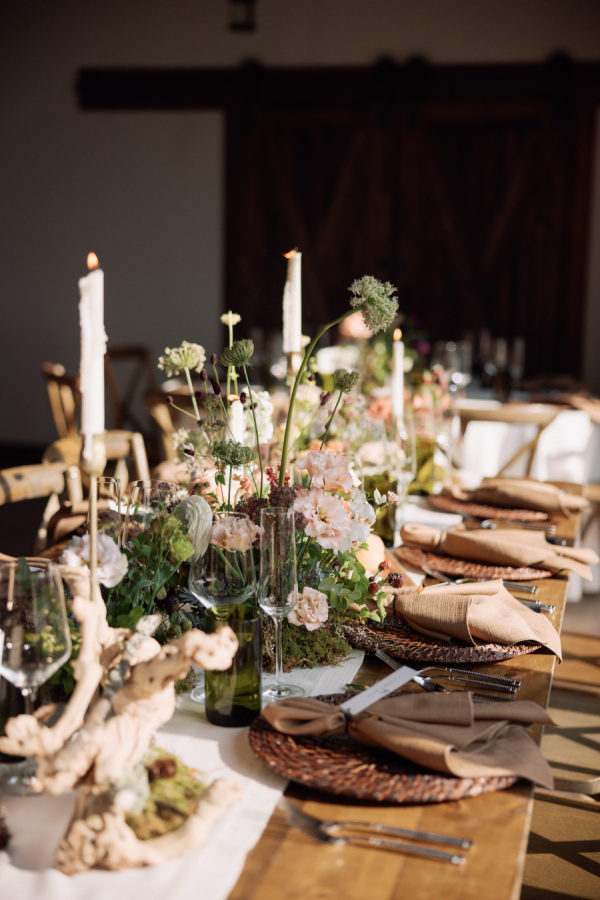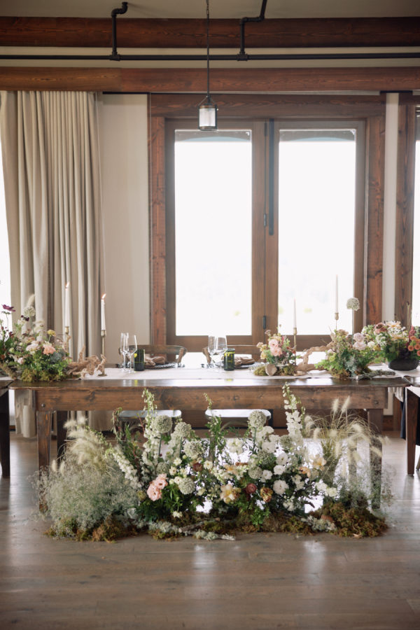 The floral arrangements and decor were designed to reflect the natural beauty of Montana with a touch of sophistication. A stunning mix of lush blooms included lisianthus, Queen Anne’s lace, scabiosa, sweet peas, brownie tulips, fresh raspberries, butterfly ranunculus, dahlias, chrysanthemums, and vibrant allium, creating an organic aesthetic. Tables were adorned with artistic installations that felt both wild and refined, featuring driftwood, delicate mushrooms, and other natural accents. To enhance the ambiance, brass taper candlestick holders and off-white candlesticks added a warm, inviting glow.