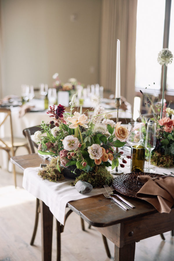 Shades of forest and moss greens, subtle pops of burgundy with pops of plum and peachier tones to bring in a summery feel, while keeping the colors warm to stay true to the couple’s style. We opted for heavier white florals with subtle color pops to keep the ceremony on season and brought in a bit more color for the reception space.