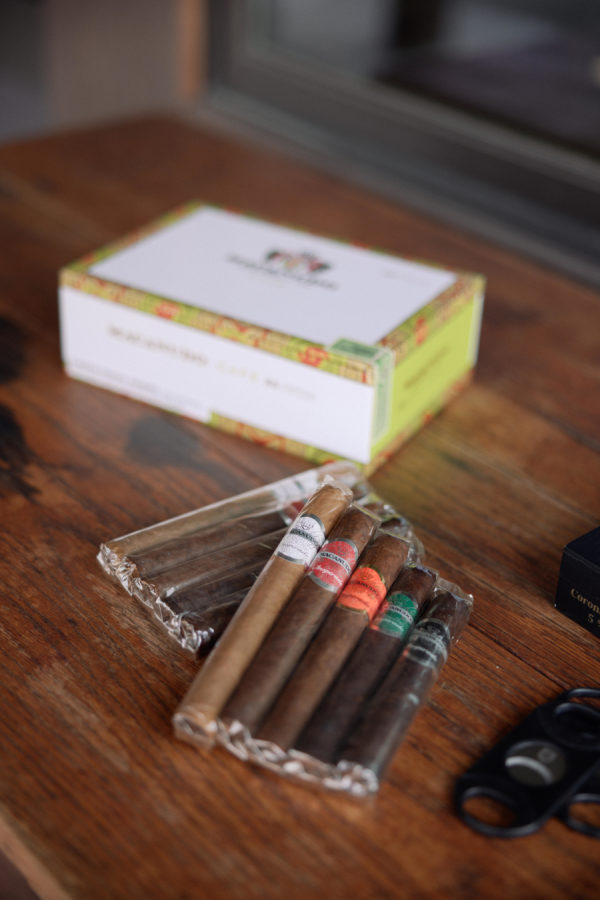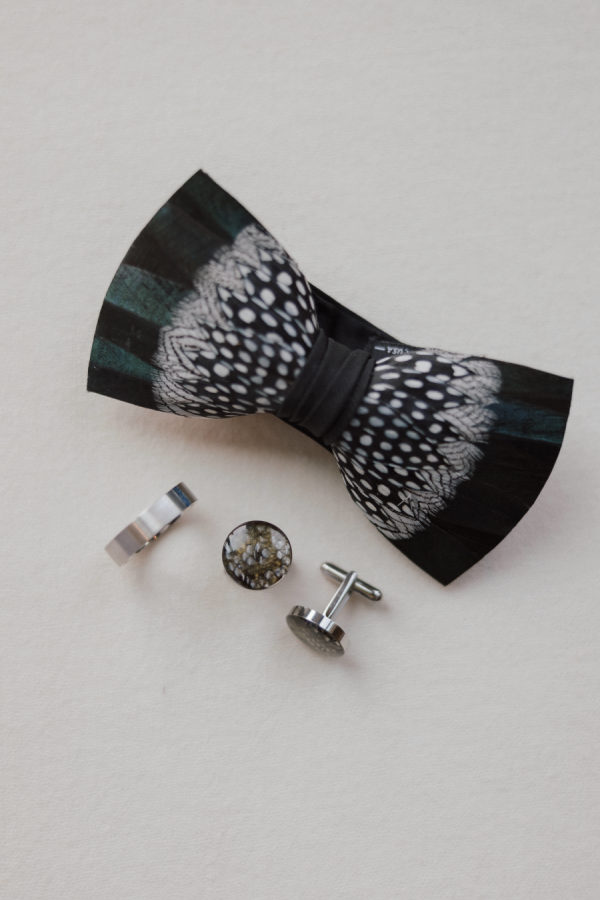 The groomsmen sported classic tuxedos, embodying timeless elegance for the occasion. In contrast, the groom stood out in a sleek black tuxedo that featured a distinctive feather bow from Brackish in the style “Drifter” paired with a guinea fowl feather pocket square. He had river trout skin cuff links gifted from his beautiful bride that originated from Estonia using a design gallery called Ererüs. This unique accessory added a touch of personality and sophistication, perfectly complementing the overall formal aesthetic while maintaining a hint of individuality amidst the classic style of his party.