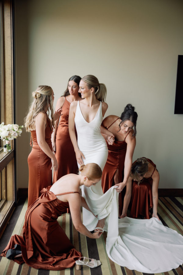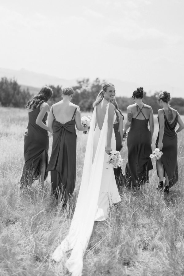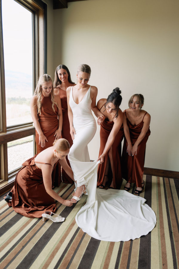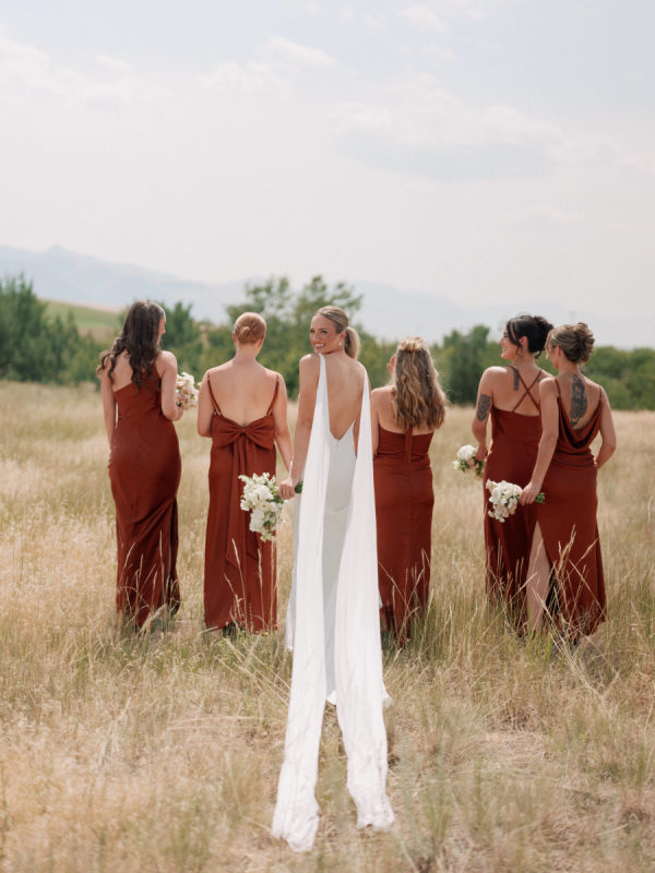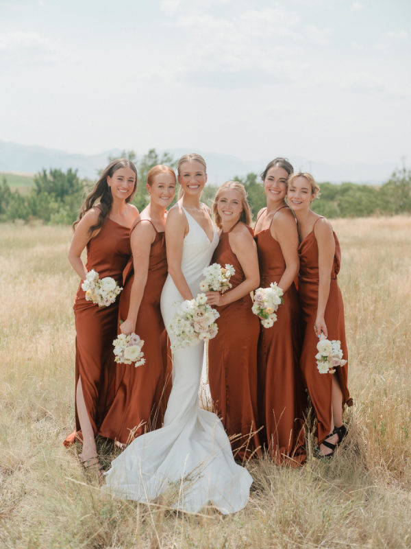 The bridesmaids showcased stunning silk terracotta rust-colored gowns from Revelry, adding the warmth we desired to the color palette. These dresses beautifully complemented the natural landscape, standing out elegantly against the golden grass of the fields. The rich hues not only enhanced the overall aesthetic of the event but also created a striking visual harmony with the surrounding scenery.