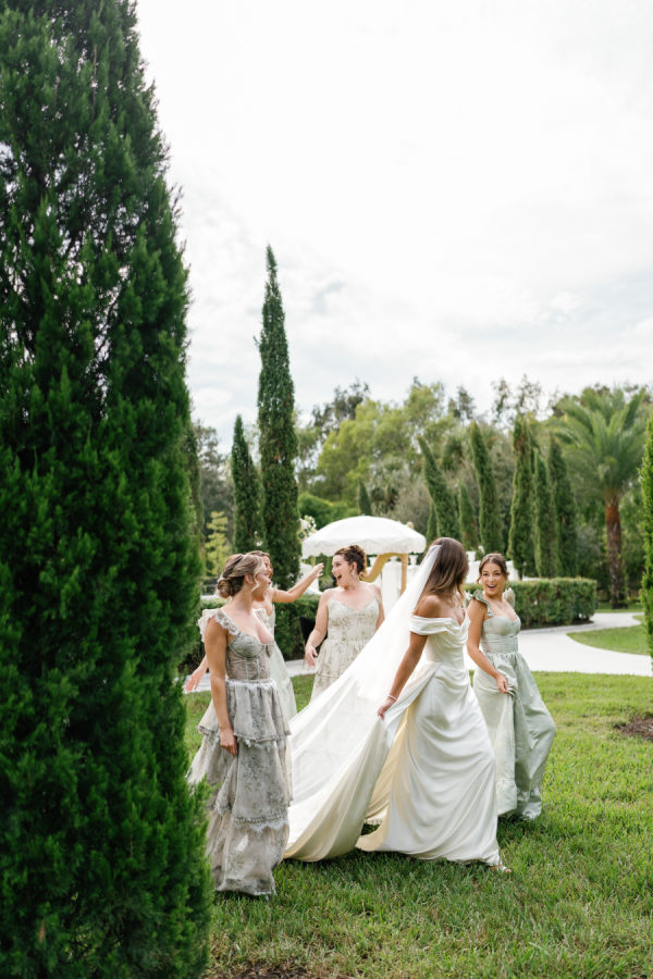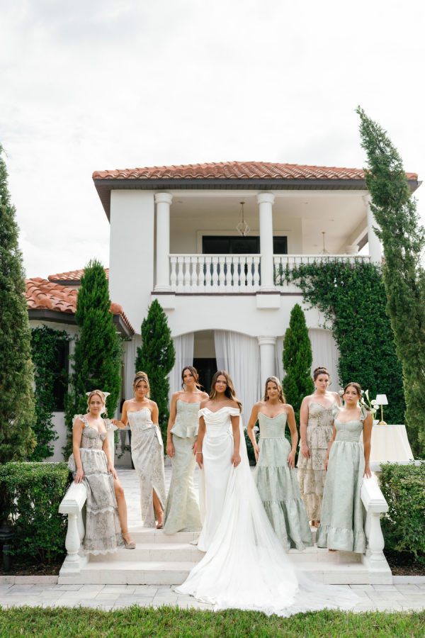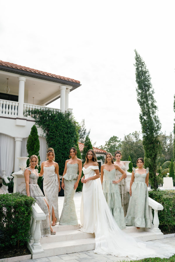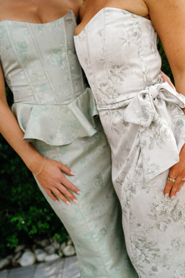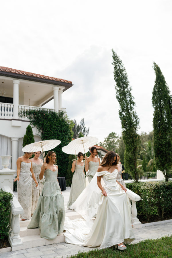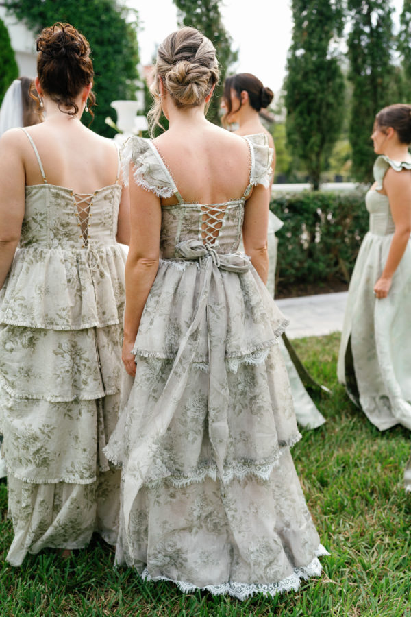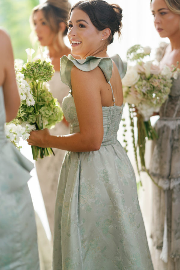 The Bridesmaids were dressed in mixed V.Chapman sage Tapestry and Sage Windsor Brocade dresses. The white parasols were the perfect accessory to complete the romantic garden party look.