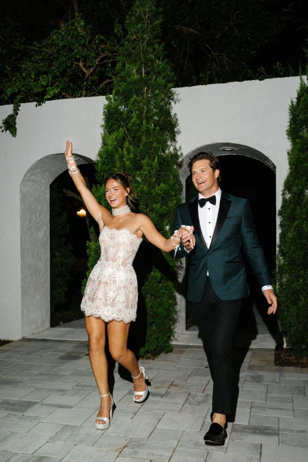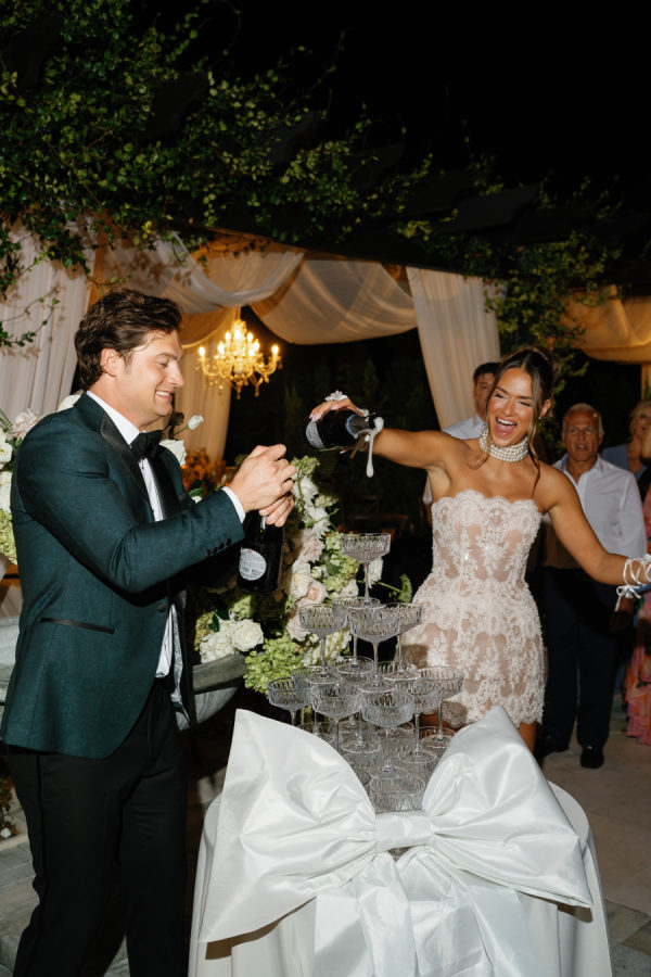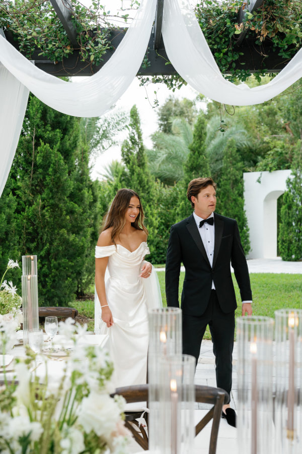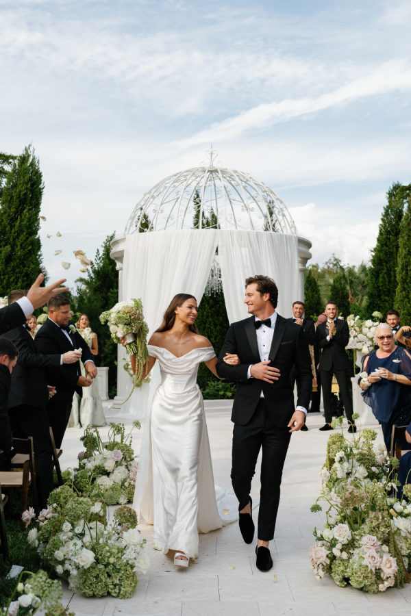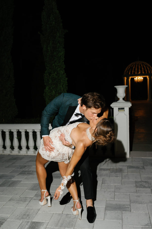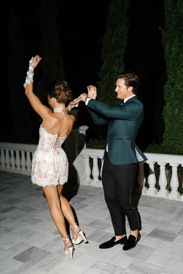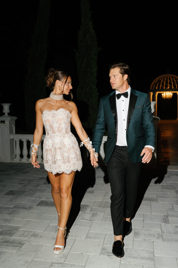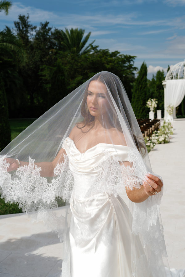 Kylia chose a sleek, satin, form-fitting, quintessential Vivienne Westwood Corset bodice gown with a draped skirt and flowing overskirt. She also wore a two-tiered, wide Chantilly lace wedding veil in cathedral length from the Etsy shop Veils by Rebecca. Kylia changed into an embroidered lace corset mini dress by Bronx and Banco for dancing.