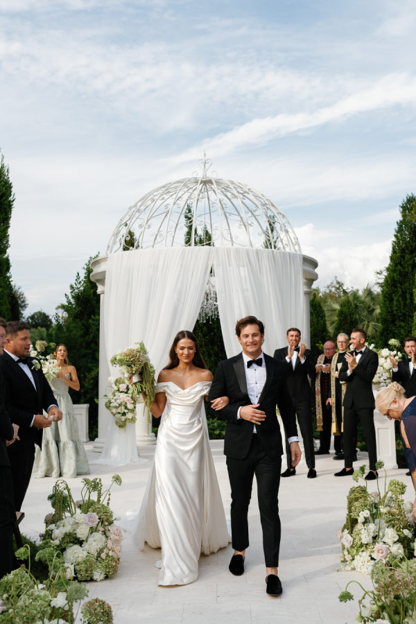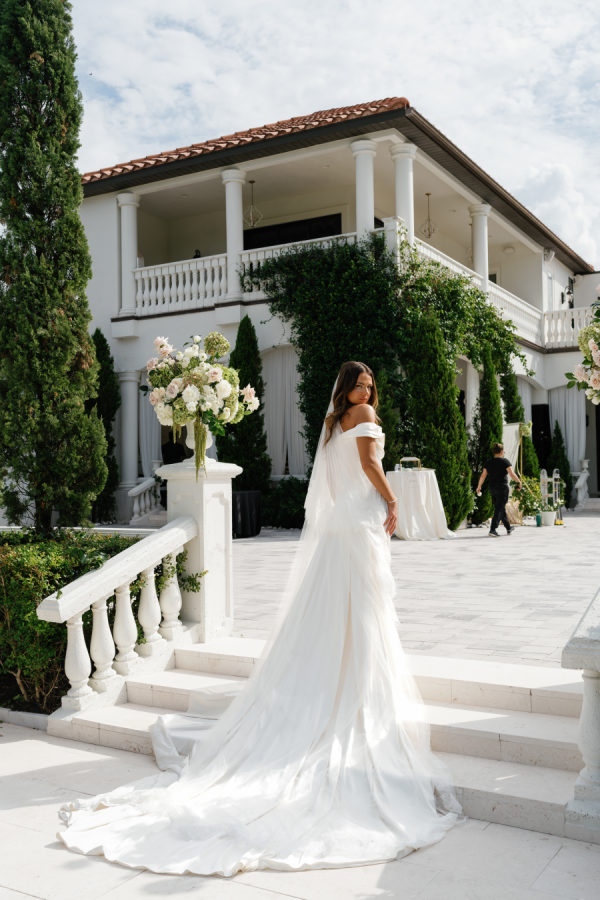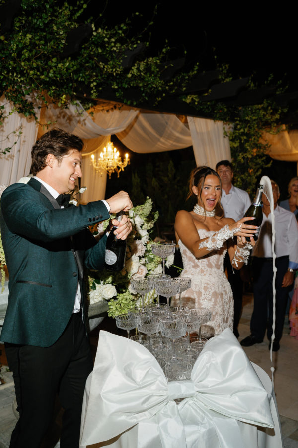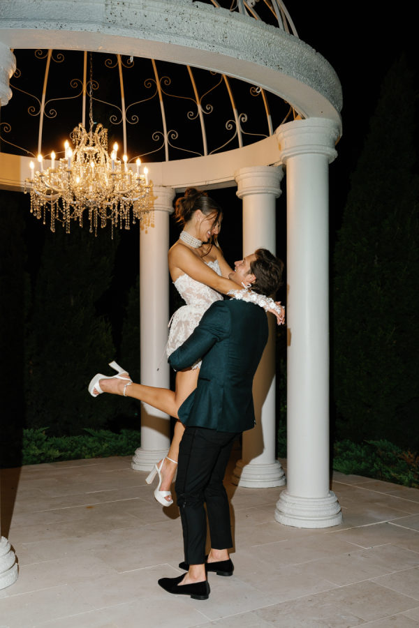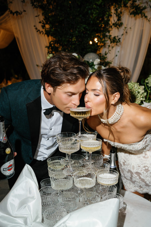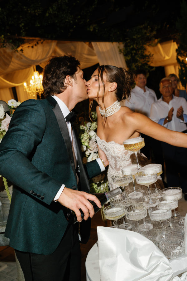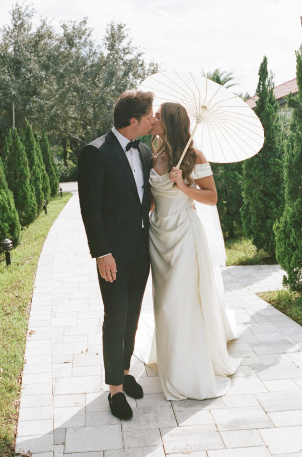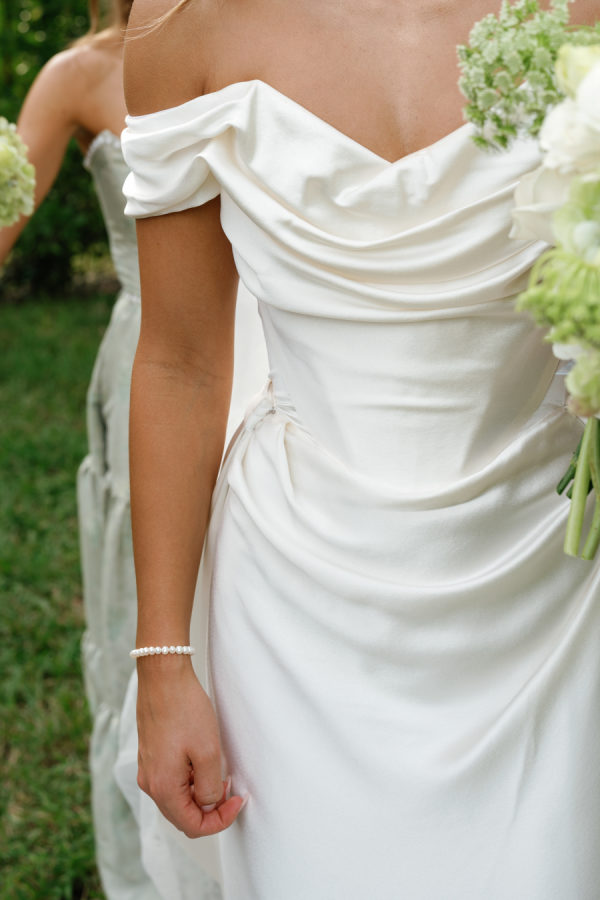 Kylia chose a sleek, satin, form-fitting, quintessential Vivienne Westwood Corset bodice gown with a draped skirt and flowing overskirt. She also wore a two-tiered, wide Chantilly lace wedding veil in cathedral length from the Etsy shop Veils by Rebecca. Kylia changed into an embroidered lace corset mini dress by Bronx and Banco for dancing.