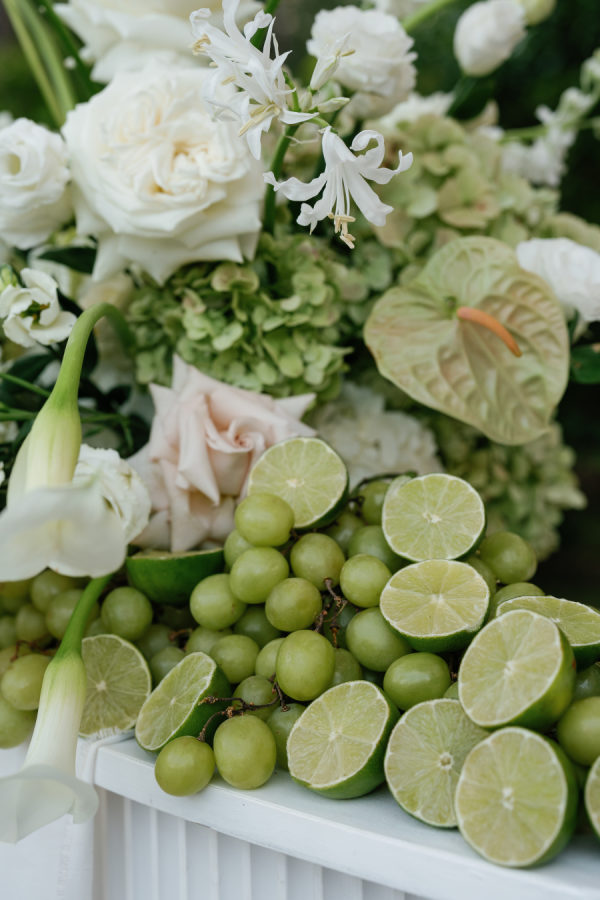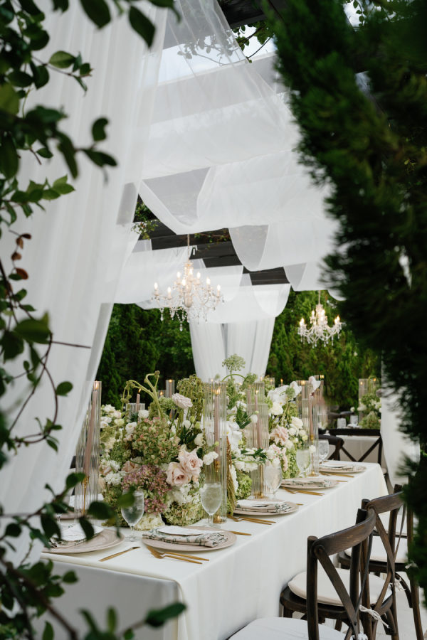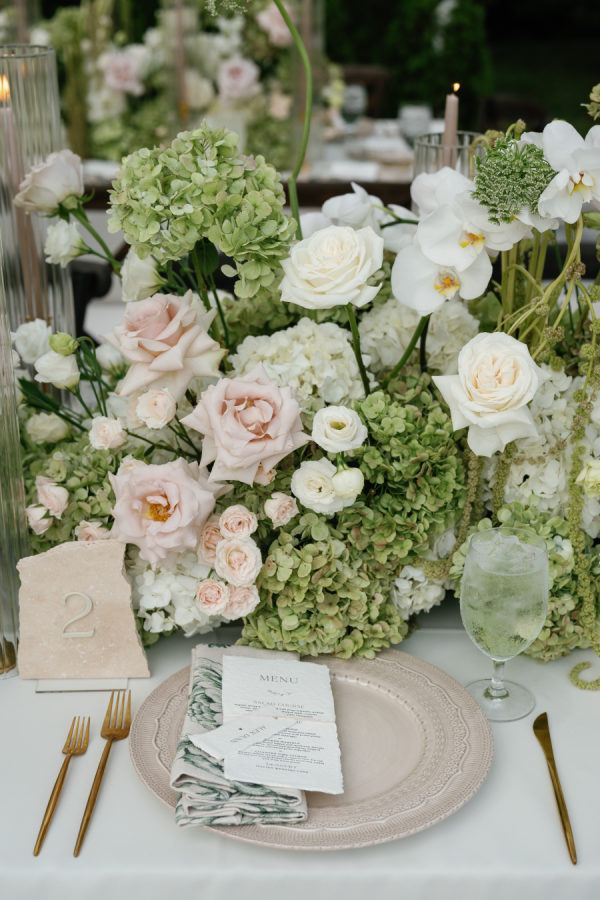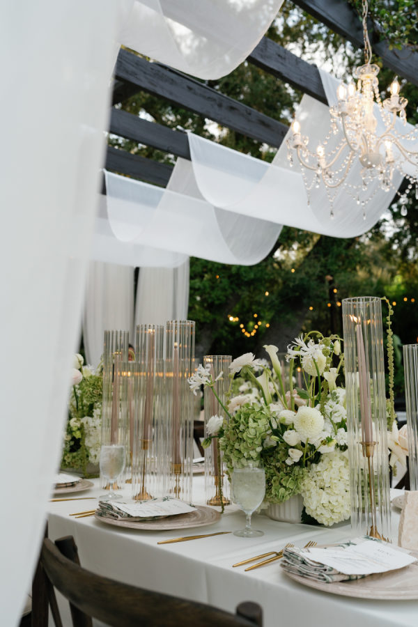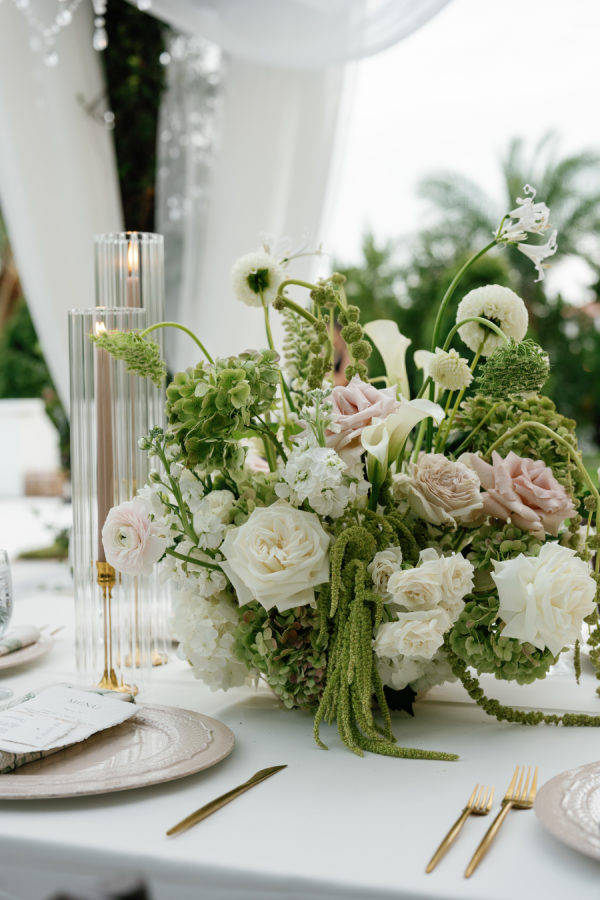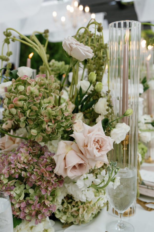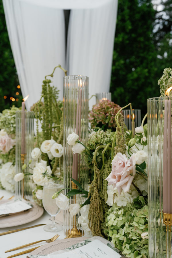 Nandina Grove brought Kylia and Matt’s organic and modern romantic vibe to life using antique green hydrangeas, blush garden roses, and cascading green amaranthus with orchid accents. They opted for nude blush tapered candles in riveted glass tunnels to accent the lush florals.