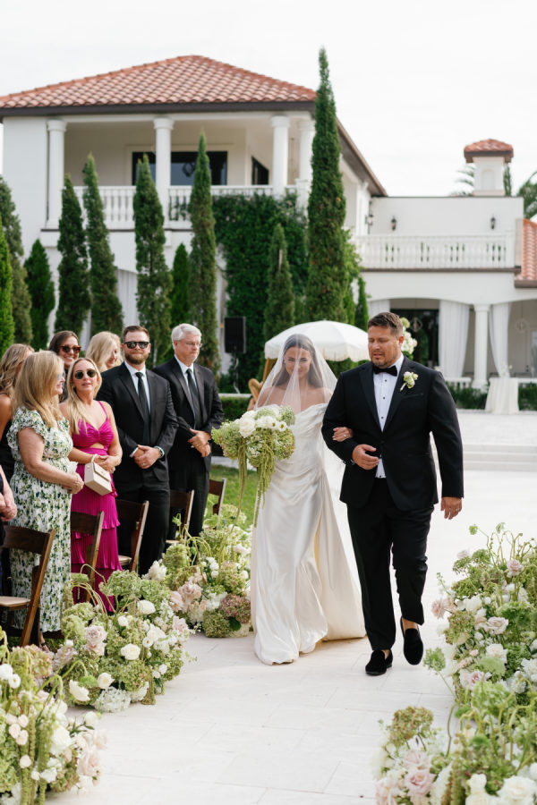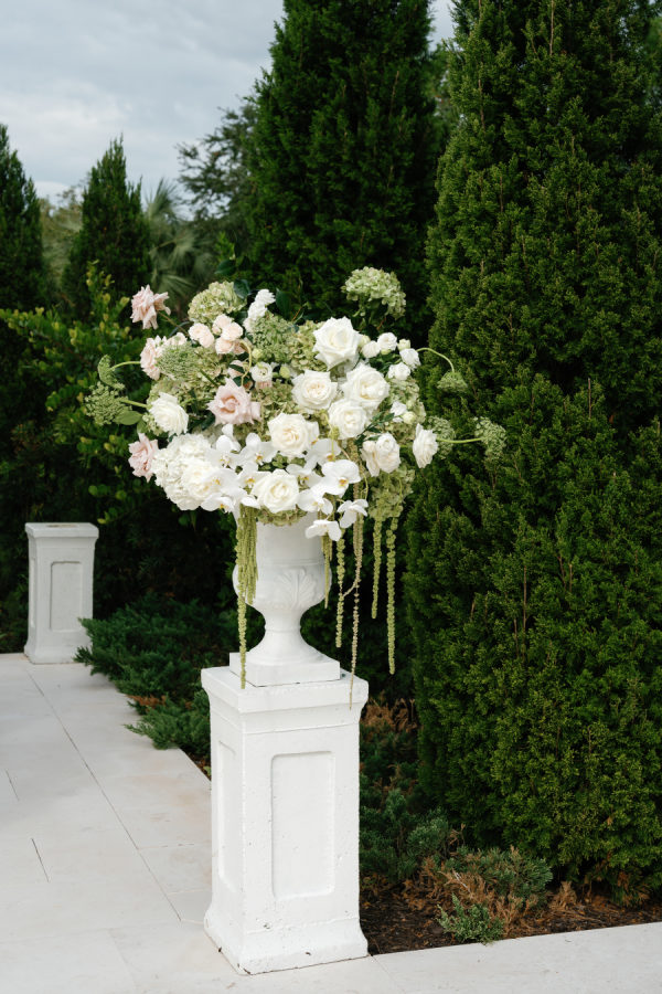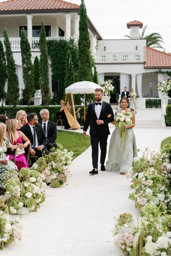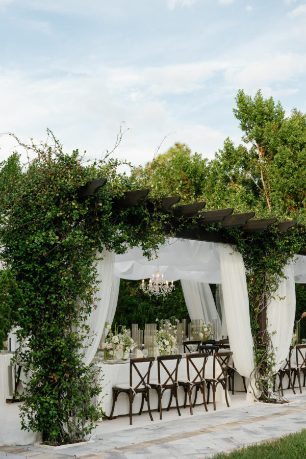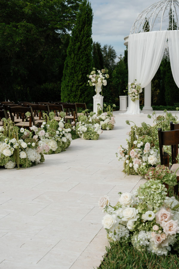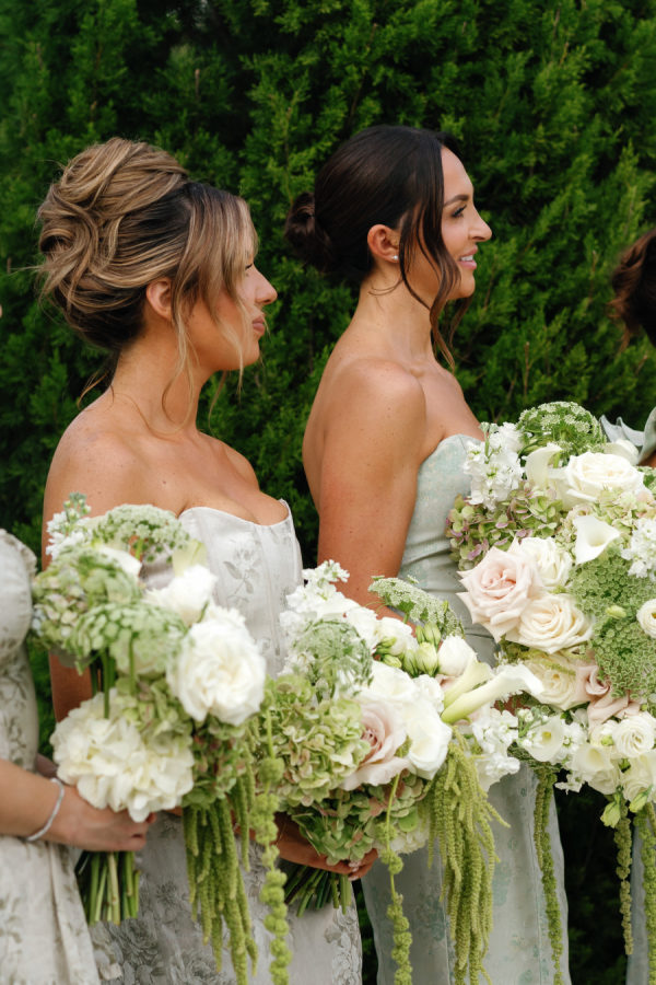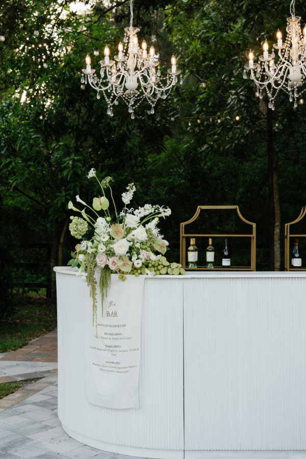 Nandina Grove brought Kylia and Matt’s organic and modern romantic vibe to life using antique green hydrangeas, blush garden roses, and cascading green amaranthus with orchid accents. They opted for nude blush tapered candles in riveted glass tunnels to accent the lush florals.